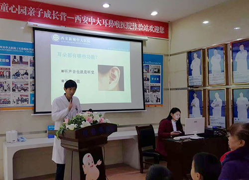 活动项是耳鼻喉基本知识讲课。西安中大耳鼻喉医院医生贠根远主任特别担任本次讲课老师。贠根远主任用浅显化的语言为小朋友们讲述了一个又一个具体而生动的耳鼻喉健康基本知识。小朋友们也被新奇的讲课内容所吸引,表现得十分专注。