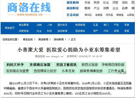 【摘自商洛新闻】继2015年11月27日下午,永寿5岁男孩小亚东车祸事件后,2016年2月13日,小亚东姐姐翟亚亚因鼻中隔偏曲、鼻窦炎于西安中大耳鼻喉医院就诊,医院获知其家庭的困难现状和悲惨遭遇后,特减免费用3000元,同时号召院内全体员工为小亚东募集爱心善款,150名员工合计捐款近3000元。